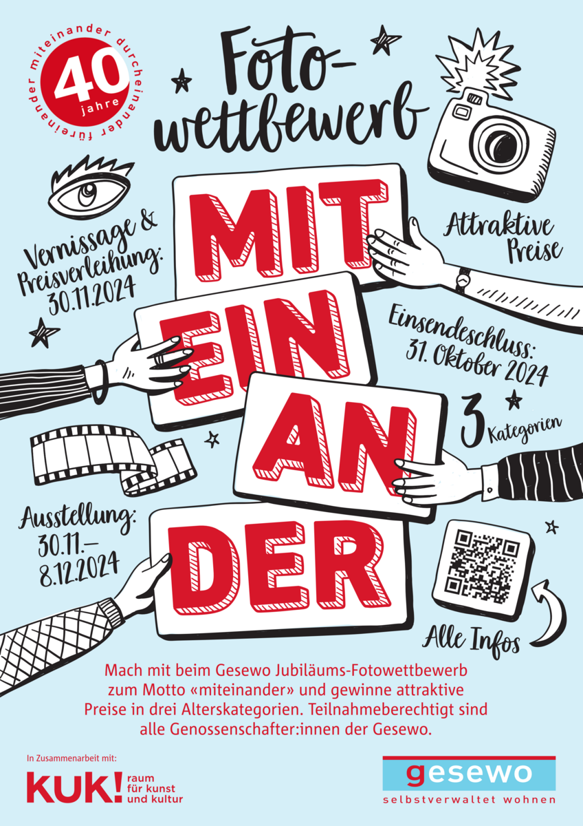 Die Fotos müssen bis 31. Oktober 2024 im Dateiformag JPG oder TIFF eingereicht werden. Bitte mit der Angabe des Alters, Vor- und Nachname sowie Kontaktmöglichkeiten (Mail, Telefon) senden an fotowettbewerb@gesewo.ch.