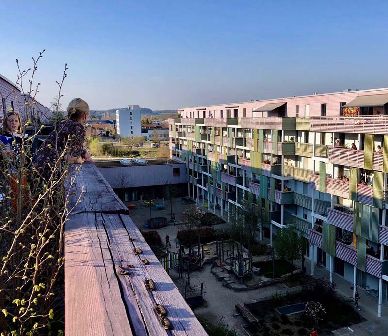 In der Giesserei sind alle kulturellen Angebote auf Eis gelegt - alle? - nicht ganz alle! In unregelmässigen Abständen wird im Giesserei-Chat auf WhatsApp zum Balkonsingen aufgerufen. Und so verbinden sich die Bewohnenden jeweils um 18 Uhr über den Innenhof und singen «Det äne am Bergli», «Aram sam sam», «S’Zündhölzli» oder «Let it be». Die durchgehenden und tiefenversetzten Balkons sind aktuell ein besonderer Segen, sie ermöglichen Kontakte zu Nachbarinnen und Nachbarn in alle Richtungen.