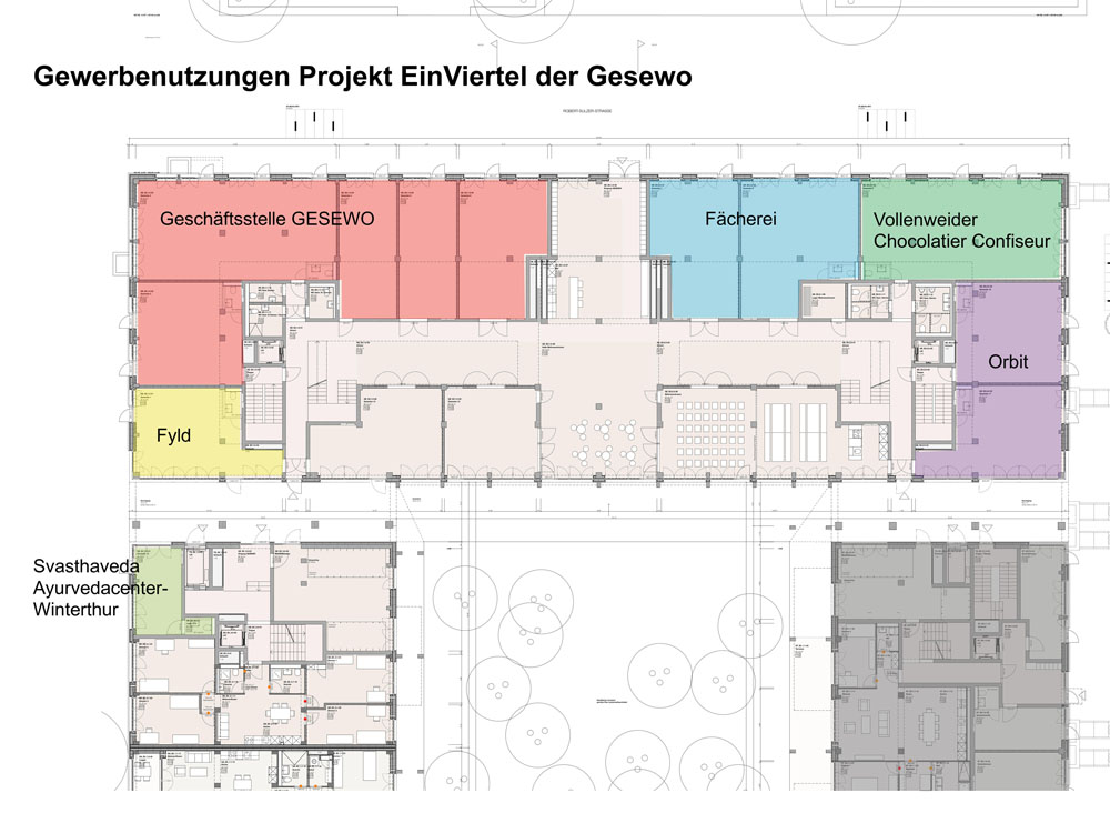 Neben der Confiserie Vollenweider werden ab November 2020 soziale und kulturelle Organisationen sowie ein Ayurvedacenter ihre Produkte und Dienstleistungen anbieten. „Seit dem Projektstart vor fünf Jahren wollten wir mit Läden, Gewerbebetrieben und Kultur für Leben sorgen, zu einem Treffpunkt mit Magnetwirkung werden und ins Quartier ausstrahlen. Mit diesen Gewerbebetrieben im Erdgeschoss unserer Neubausiedlung sind wir unserem Ziel einen grossen Schritt näher gekommen“, freut sich Geschäftsführerin Katharina Gander. Auch dass bereits ab Beginn alle Flächen voll vermietet sind, wertet sie als Erfolg, da in der Stadt Winterthur doch ein erheblicher Leerstand bei Gewerberäumen besteht.