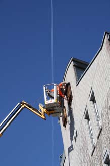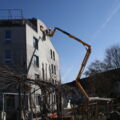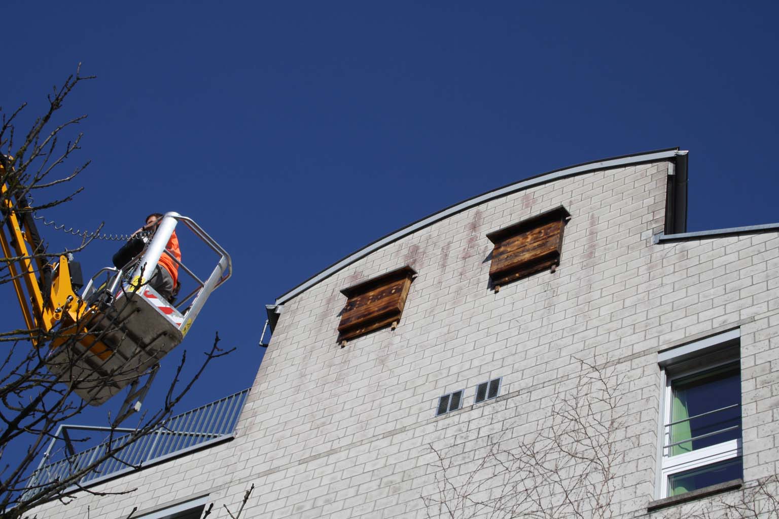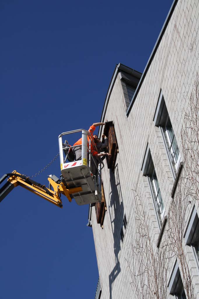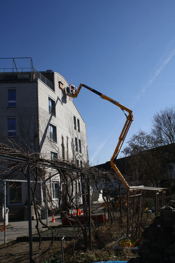 Gleichzeitig mit dem Frühlingsschnitt Kletterpflanzen konnte die Umgebungsgruppe der Sagi Hegi in luftigen Höhen ein lange gehegtes Projekt umsetzen: Eine gute Auswahl an Fledermaus-Nistkästen konnte mit Hilfe eines Drehliftes erfolgreich an den Fassaden montiert werden. Fledermausschutz ist mehr als nötig: Die rund 30 in der Schweiz vorkommenden Arten sind heute zum Teil stark gefährdet oder vom Aussterben bedroht, sämtliche Fledermausarten sind inzwischen geschützt. Wie so viele andere Kleintiere und Insekten leiden auch die scheuen Nachttiere unter der Zerstörung ihrer natürlichen Lebensräume (alte Bäume, offene Dachstöcke und Scheunen, Trockenmauern, ungestörte wilde Winkel), vor allem aber unter der intensiven Anwendung von Pestiziden in der Landwirtschaft.