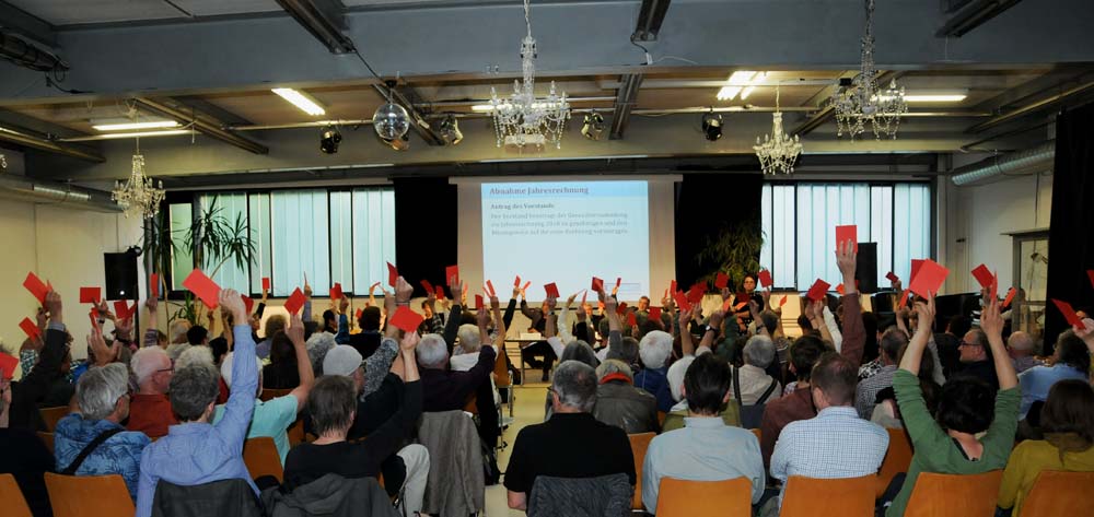 Rund 100 Genossenschafterinnen und Genossenschafter und 10 geladene Gäste nahmen am 22. Mai 2019 an der Generalversammlung (GV) im Osttor teil. Vor der Versammlung nahmen knapp 80 Interessierte die Gelegenheit wahr, die Baustelle des Projekts EinViertel in der Lokstadt zu besichtigen (Impressionen hier). Der Apéro vor der GV bot Gelegenheit für Begegnungen und Austausch.