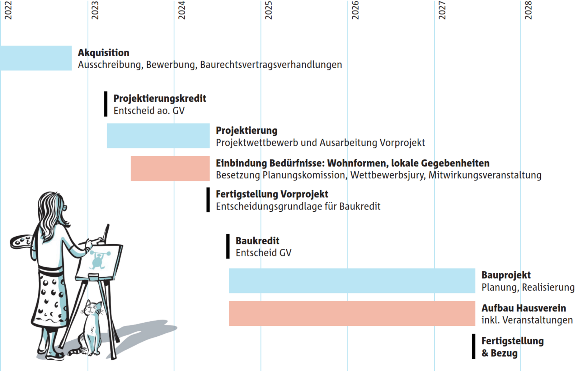 Nachdem die Gesewo anfangs 2022 den Zuschlag auf ihre Bewerbung für das Baurecht erhalten hat, haben Vorstand und Geschäftsstelle unter anderem mit einer Machbarkeitsstudie das Projekt weiterentwickelt, detailliertere Berechnungen vorgenommen und den Baurechtsvertrag verhandelt. Die Hinweise der Genossenschafterinnen und Genossenschafter an der Info- und Partizipationsveranstaltung Ende Oktober 2022 haben unmittelbar massgeblich zur Schärfung des Projekts beigetragen. Auch konnten erste Anregungen für die Projektierung entgegengenommen werden.