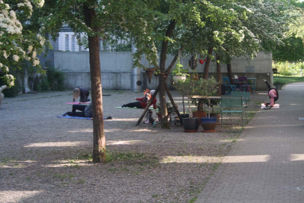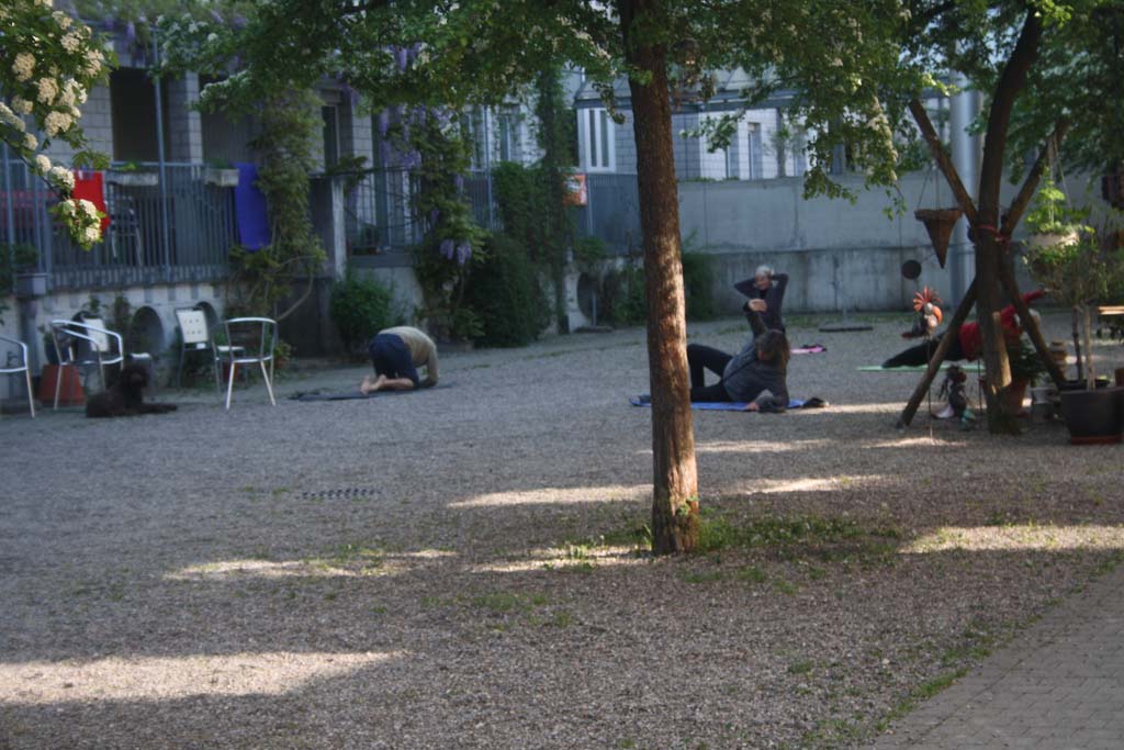 Neben wilden Welpenspielstunden der Kleinst-Vierbeiner findet im Innenhof täglich Morgen- Yoga statt zur Entspannung - angeleitet von Röbi Schwarzenbach mit Pudel.