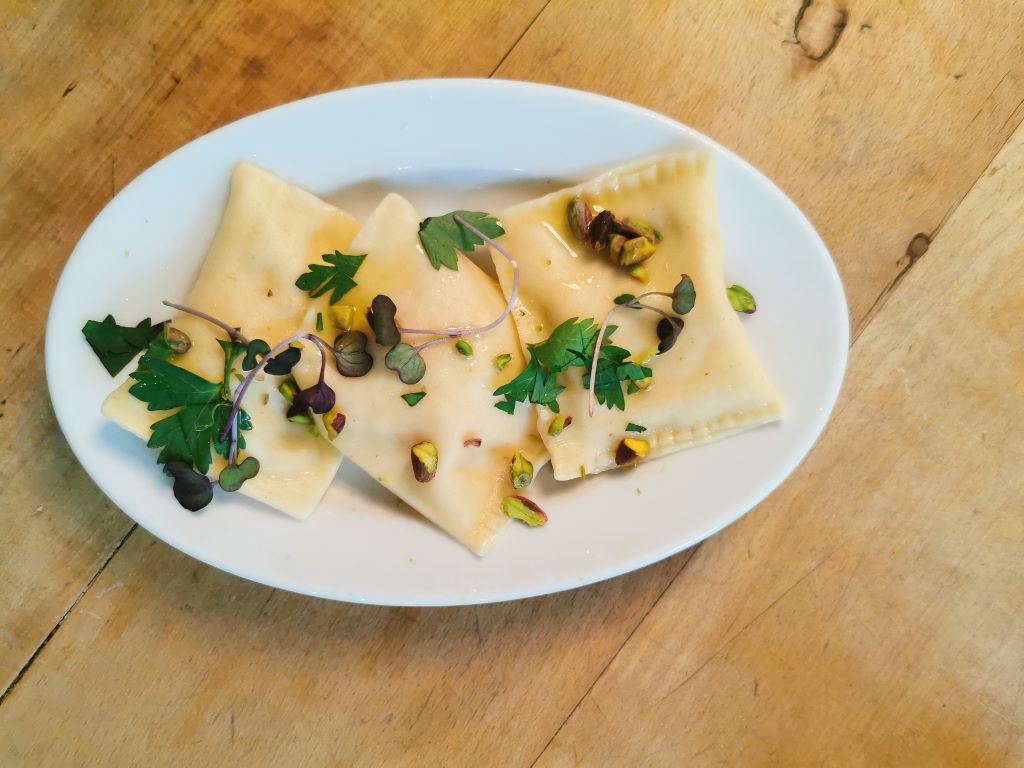 In jedem Gericht gab es mindestens eine Zutat aus unserem Garten: vom Kürbis als Suppe zum Kürbis im handgemachten Ravioli, vom Kürbis im Ofen zum Kürbis im kanadischen Kuchen, das Lamm im Topf und das Lamm auf dem Grill, Palmkohl, Peperonata, Polenta, Kartoffeln als Trüffeltürmchen, Feigenchutney, Quittenpästeli, Zwetschenmus und Hagebutten-Mousse … schon mal was vom Schlaraffenland gehört? Wir verraten es euch: es war kurzzeitig in Waltenstein zu finden!