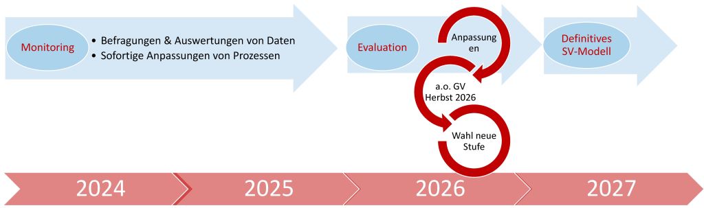 Um die finanzielle Auswirkung der Stufenwahl zu klären und gleichzeitig zu überprüfen, ob sich das neue dreistufige Modell bewährt, gelten die ersten drei Jahre als Pilotversuch. Wenn es sich zeigt, dass Abläufe verbessert werden können, werden die Optimierungen sogleich umgesetzt. Das Modell und die Abläufe werden zwei Jahre lang systematisch überprüft, im dritten Jahr erfolgen die Auswertung und die Anpassungen, damit voraussichtlich ab 2027 das justierte Selbstverwaltungsmodell gelebt werden kann.