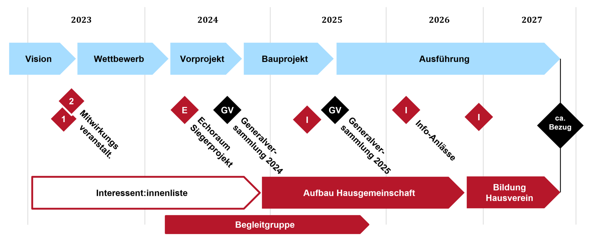 Der Mitwirkungsfahrplan sieht vor, dass die künftige Hausgemeinschaft ab der Genehmigung des Bauprojekts (GV 2025) aufgebaut werden soll. Der Hausverein wird vor Bezug gegründet.