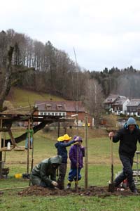Es ist vollbracht: Bewohnende der Alten Bäckerei pflanzten ihren ersten Hochstamm Apfelbaum für kommende Generationen: Der Wehntaler Hagapfel ist ein super Mostapfel, der dem Schorf, dem Feuerbrand, dem Mehltau und anscheinend sogar der neusten Obstbaumkrankheit, der Marssonina, trotzt. Damit wird der Alten Bäckerei der Apfelsaft und den Bienen ihre Arbeit nicht ausgehen. Gleichzeitig ist dieser Baum der erste Schritt in Richtung Verjüngung des Obstgartens. So stehen dort nun von ganz jungen über nicht mehr so junge bis hin zu vergreisten Bäumen, die primär den Tieren Schlupfwinkel bieten. |
