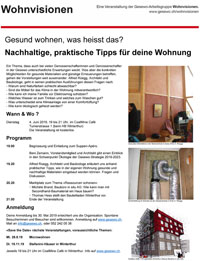 Dieses Mal befasst sich die Veranstaltung der Wohnvisionen mit den Möglichkeiten, sein eigenes Daheim gesund zu gestalten. Seien es Naturfarben, Möblierung, Elektrosmog oder eine ökologische Heizung. Ein Thema, das gut zum Jahresschwerpunkt Ökologie der Gesewo passt. Die Gesewo-Arbeitsgruppe Wohnvsionen organisiert regelmässig Veranstaltungen über visionäres und innovatives Wohnen. Wann & wo? |